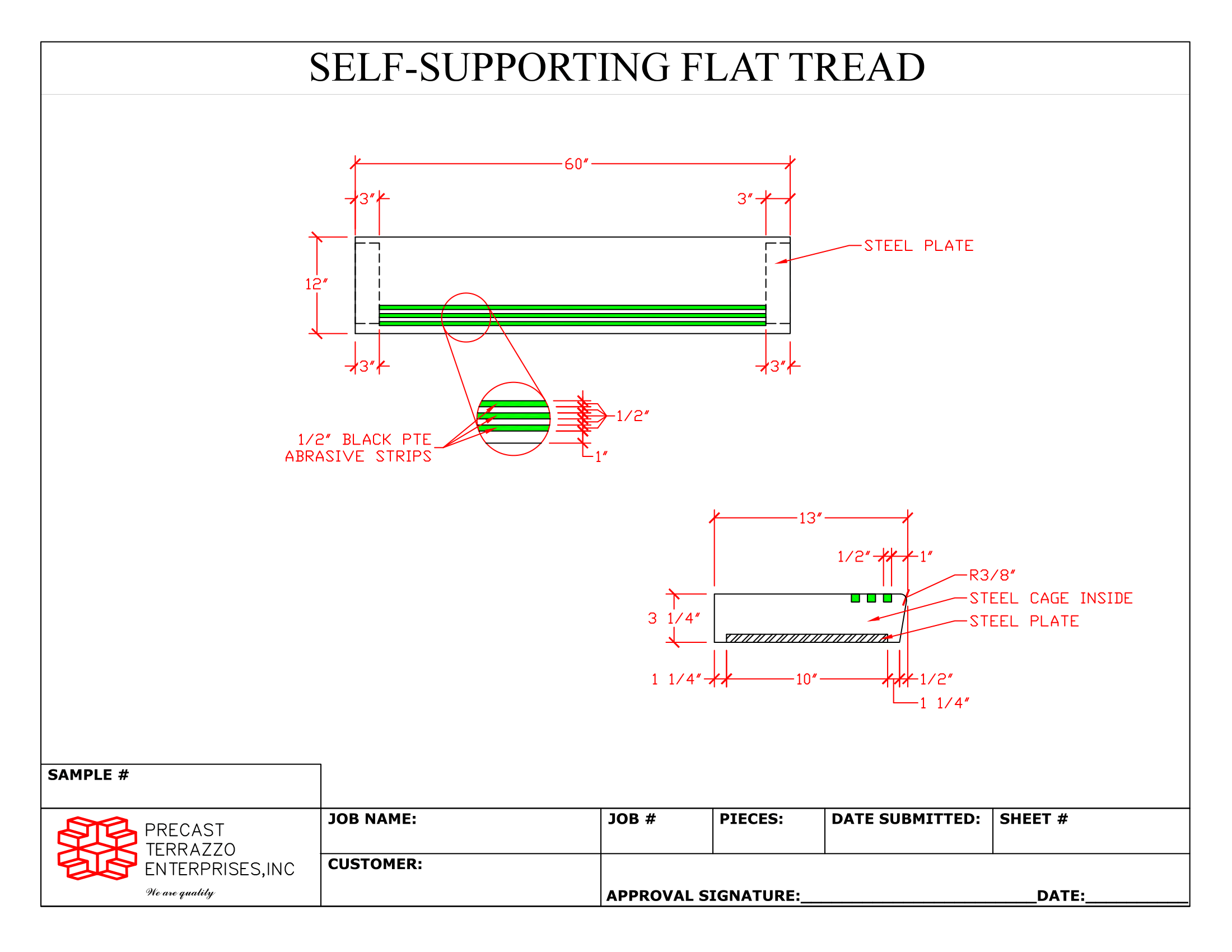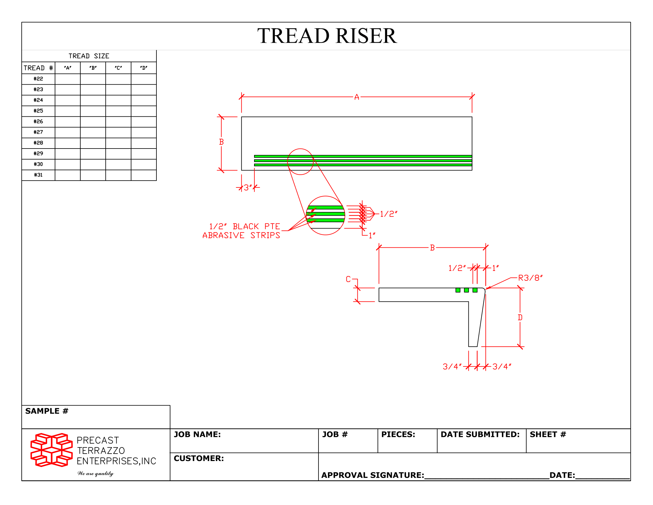 The dimensions needed to be filled out are labeled VIF and highlighted in yellow. In the case of the treads, there is a schedule that can be filled out with the corresponding items. There are other dimensions on the tickets that are our standard dimensions for these items. Any of these can be adjusted BUT they would have to be noted so that we can provide you the most accurate information. Of course, we will want you to indicate the number of pieces to be made for each drawing. It is always helpful if you send us the underlying architectural detail for your precast items. Please call us at 919-231-6200 with any questions and we hope these are helpful for